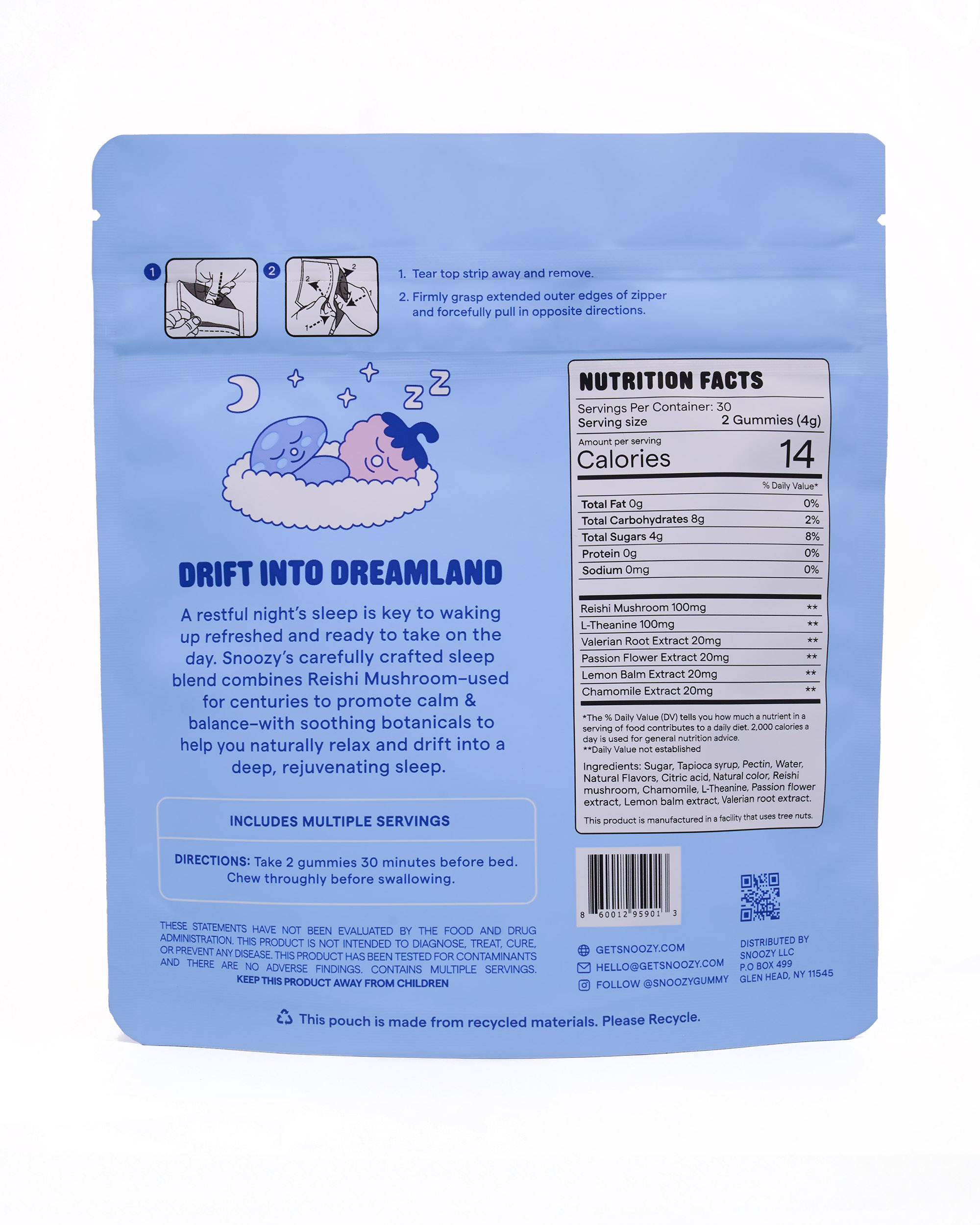 A recommended serving of Snoozy depends on the consumer, but we recommend taking 1 gummy to start and 1 – 2 gummies for optimal effects.